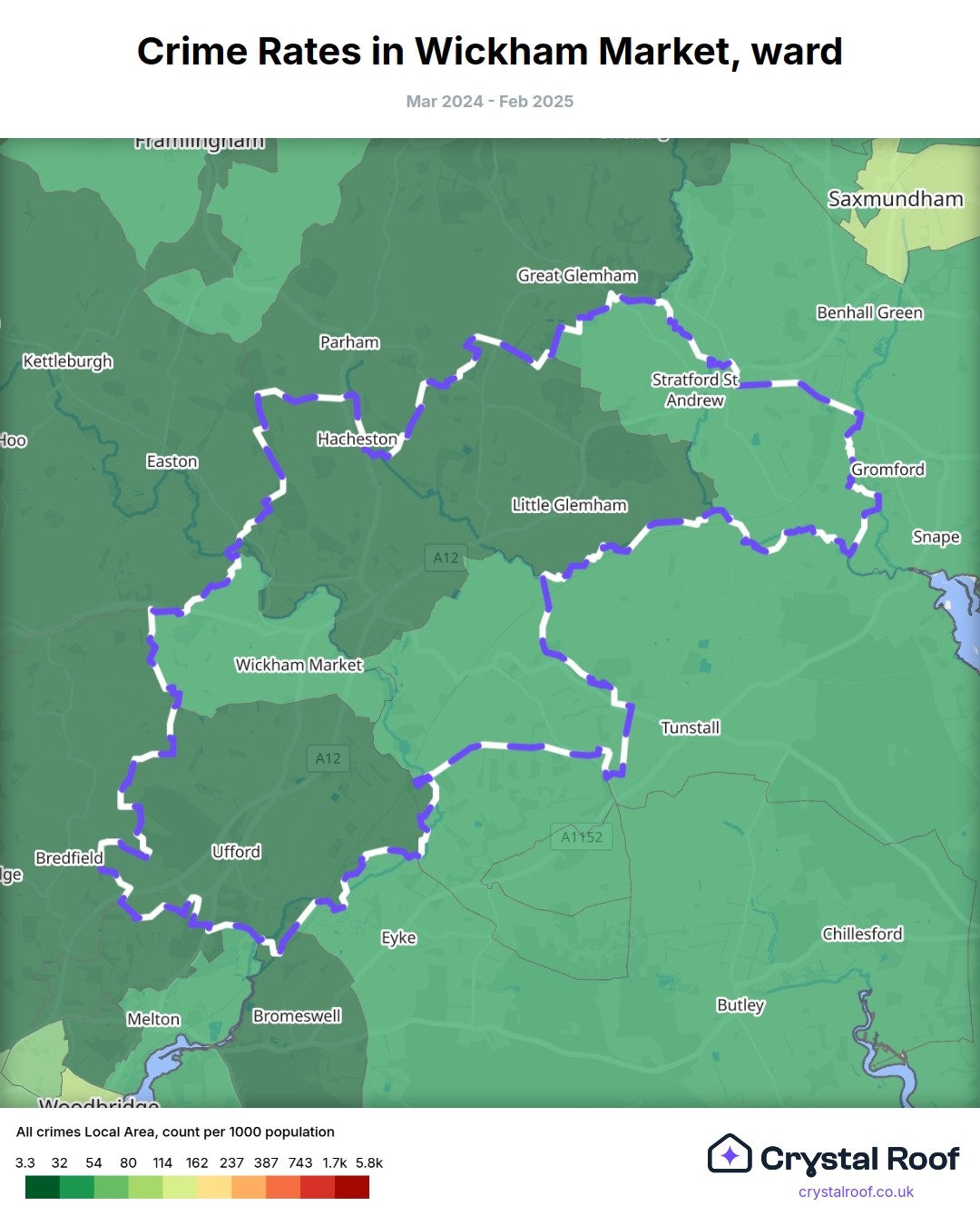 Wickham Market, (ward) includes areas with the following crime ratings (see map):