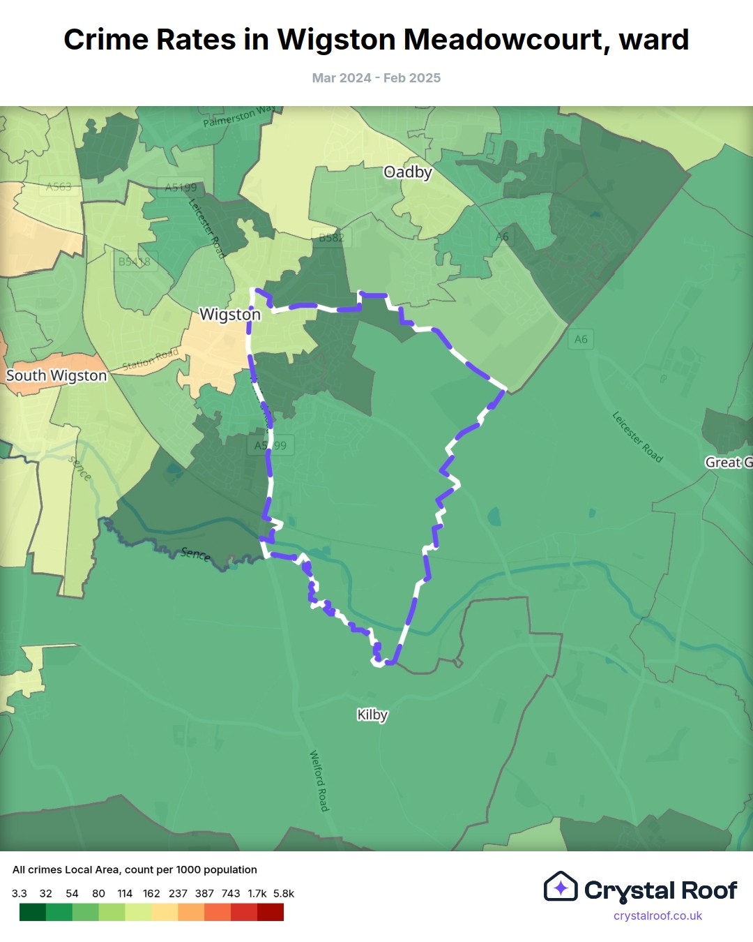 Wigston Meadowcourt, (ward) includes areas with the following crime ratings (see map):