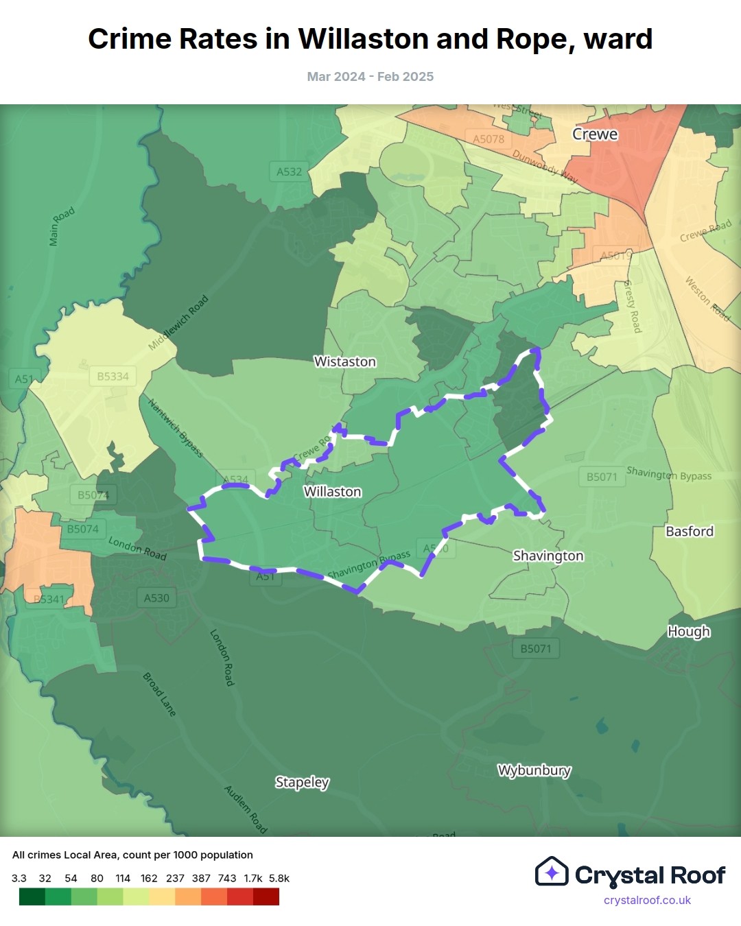 Willaston and Rope, (ward) includes areas with the following crime ratings (see map):