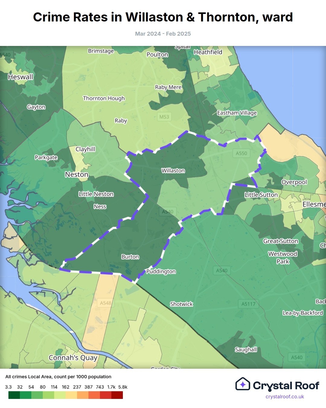 Willaston & Thornton, (ward) includes areas with the following crime ratings (see map):
