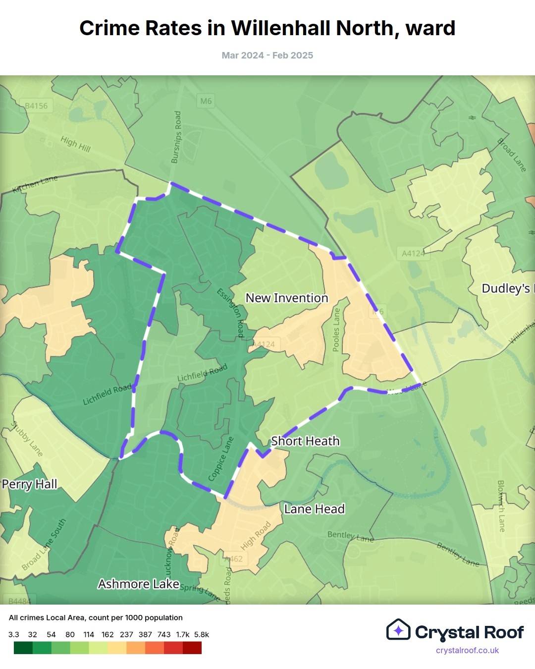 Willenhall North, (ward) includes areas with the following crime ratings (see map):