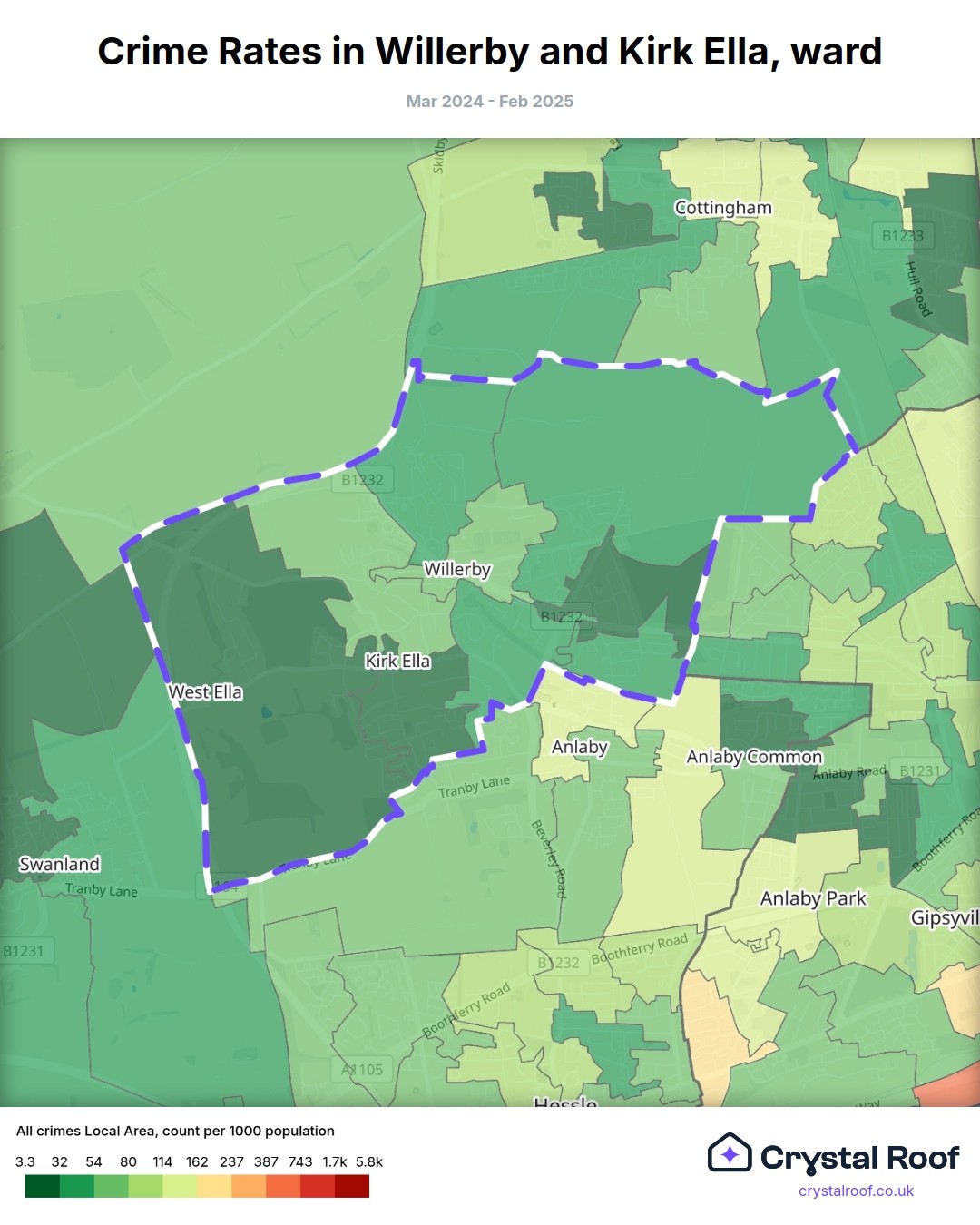 Willerby and Kirk Ella, (ward) includes areas with the following crime ratings (see map):