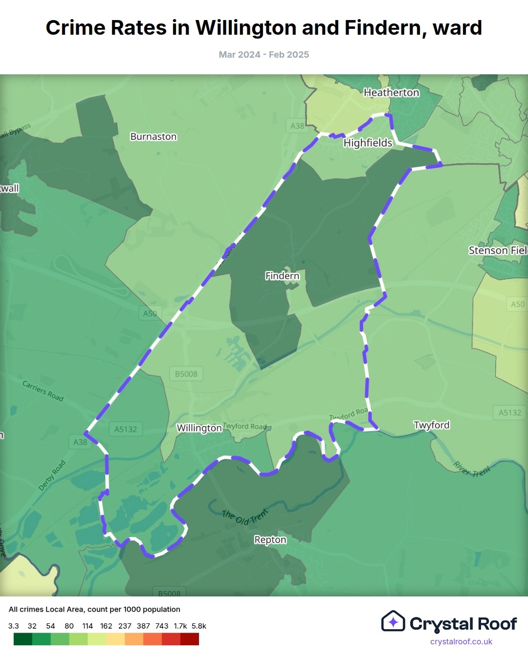 Willington and Findern, (ward) includes areas with the following crime ratings (see map):