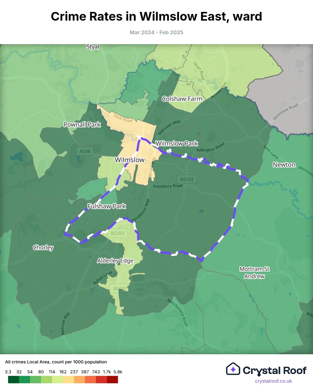 Wilmslow East, (ward) includes areas with the following crime ratings (see map):