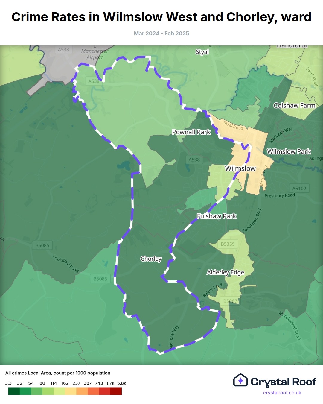 Wilmslow West and Chorley, (ward) includes areas with the following crime ratings (see map):
