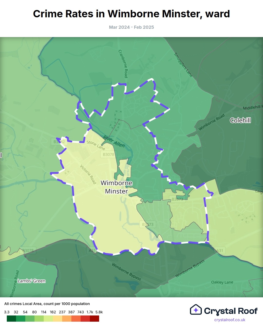 Wimborne Minster, (ward) includes areas with the following crime ratings (see map):