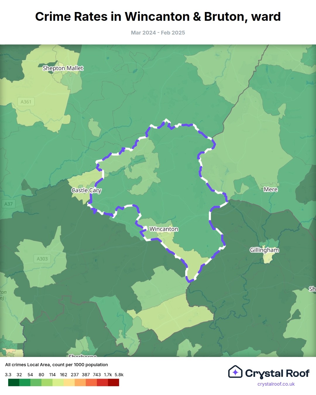 Wincanton & Bruton, (ward) includes areas with the following crime ratings (see map):