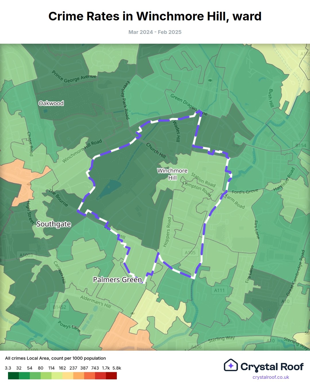 Winchmore Hill, (ward) includes areas with the following crime ratings (see map):