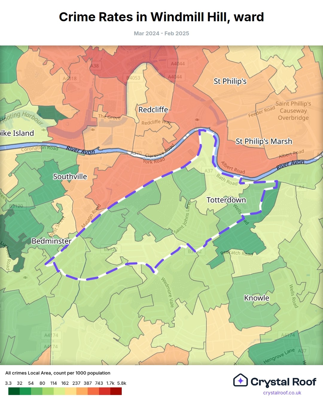 Windmill Hill, (ward) includes areas with the following crime ratings (see map):