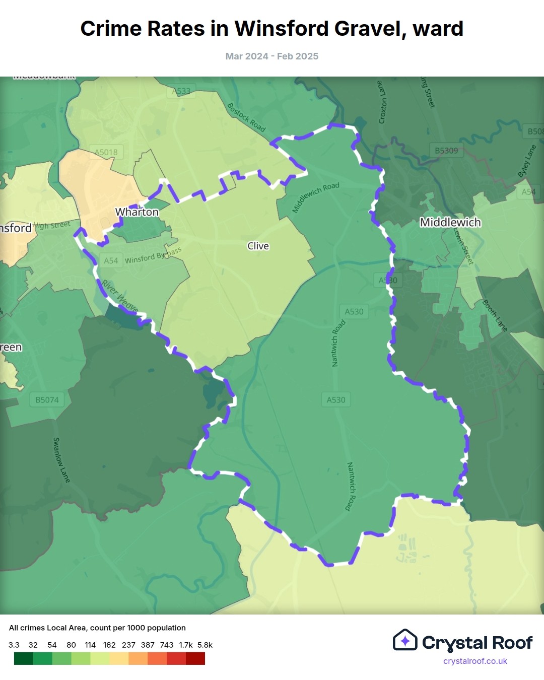 Winsford Gravel, (ward) includes areas with the following crime ratings (see map):