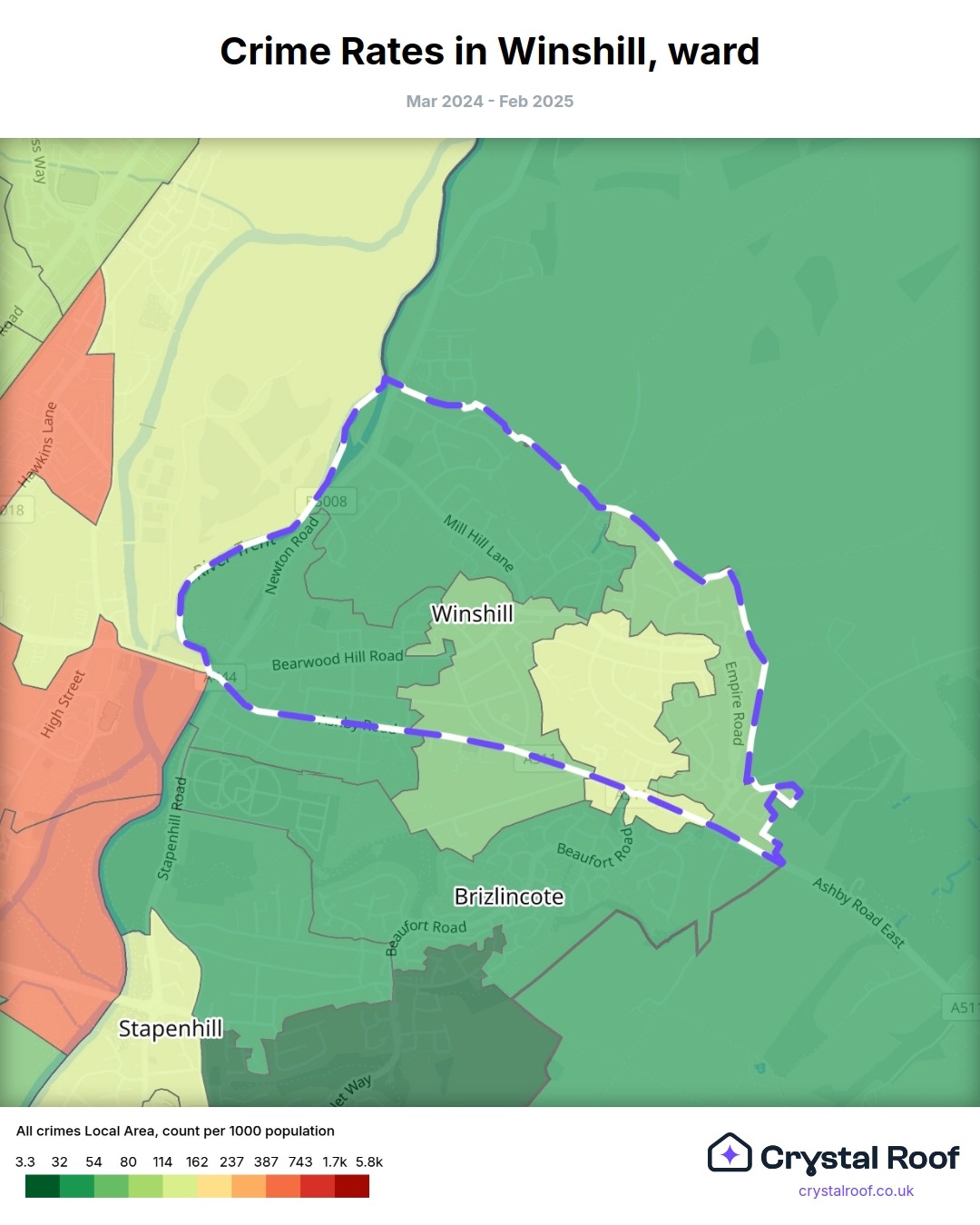 The figures in grey indicate the relative ratings of Winshill (ward) for a specific crime type compared to other wards in England and Wales.