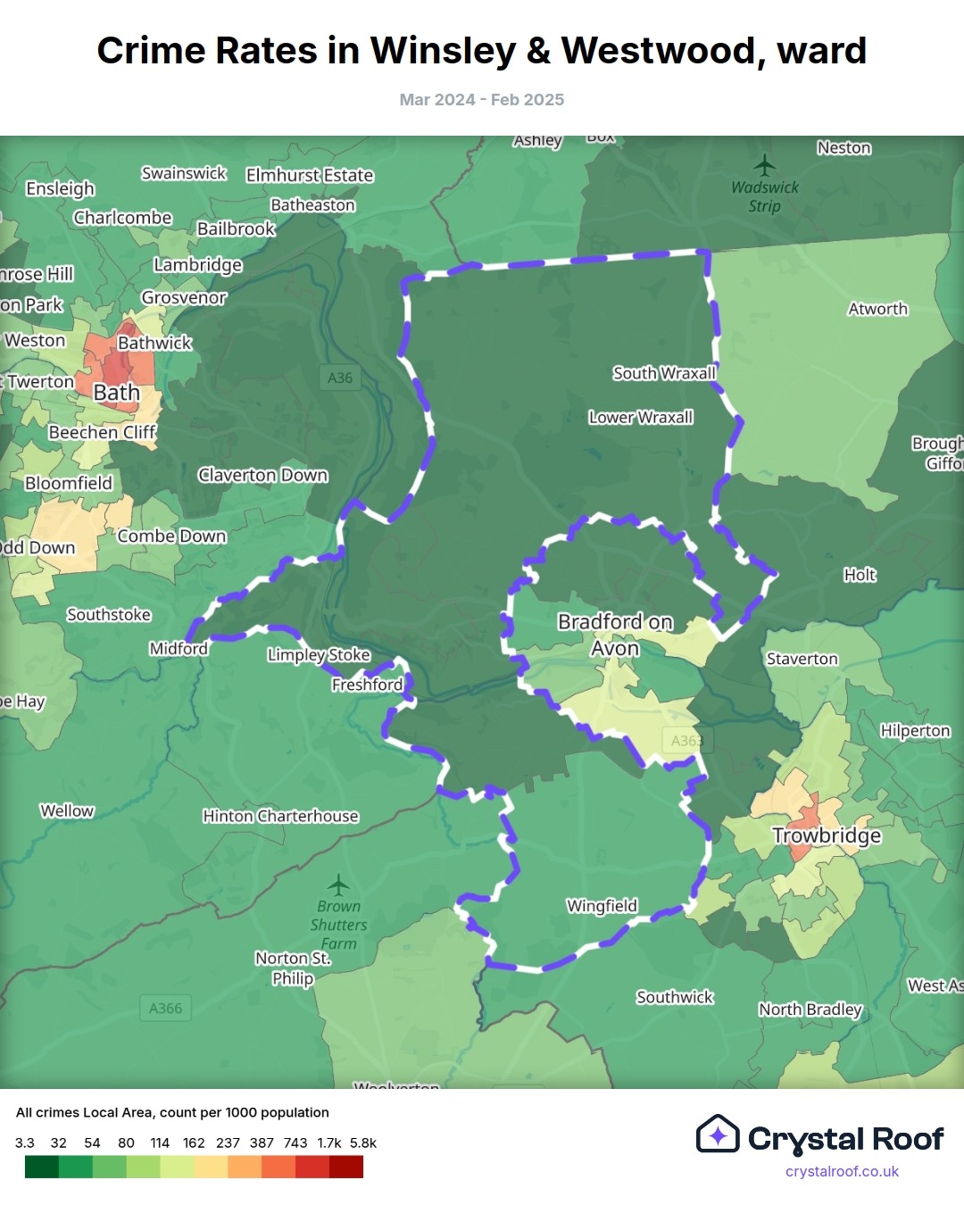 Winsley & Westwood, (ward) includes areas with the following crime ratings (see map):