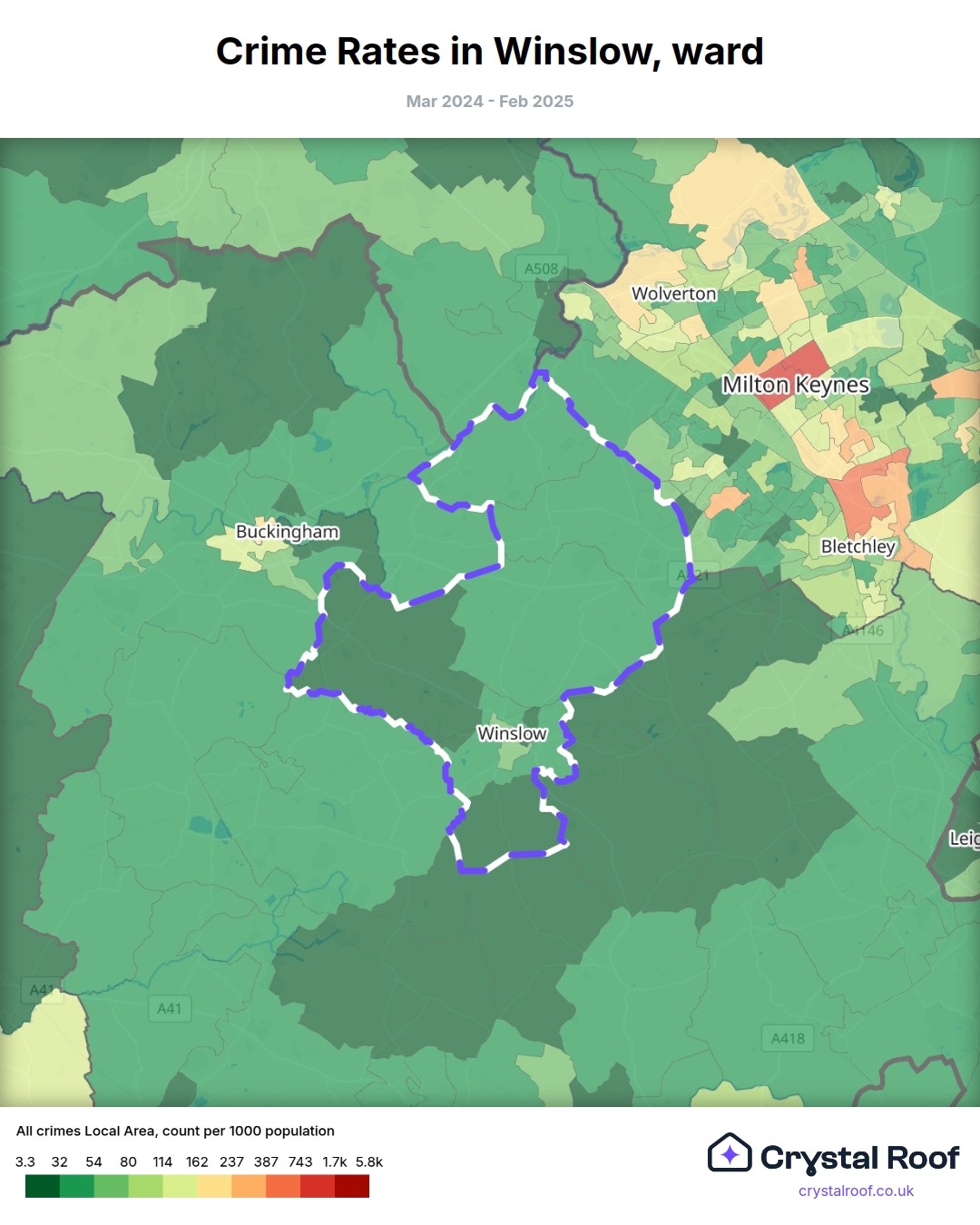 Annual total crime rate in Winslow (ward) is 55.2 per thousand resident population. This can be rated as 2 out of 10 or low crime level compared to other wards in England and Wales.