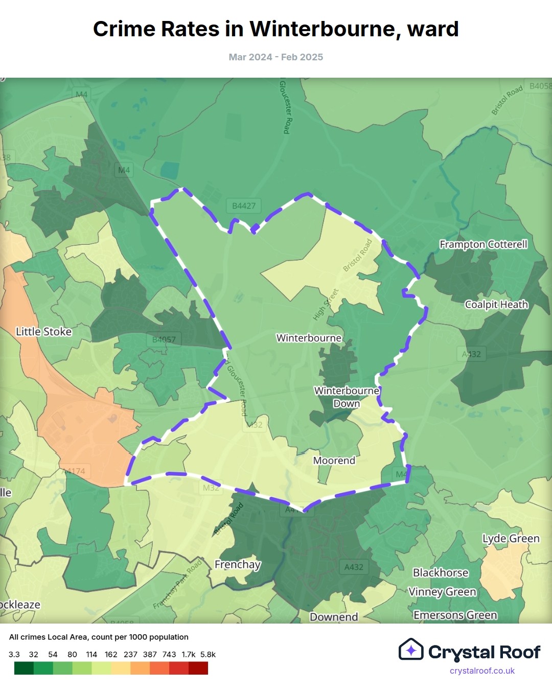 Winterbourne, (ward) includes areas with the following crime ratings (see map):