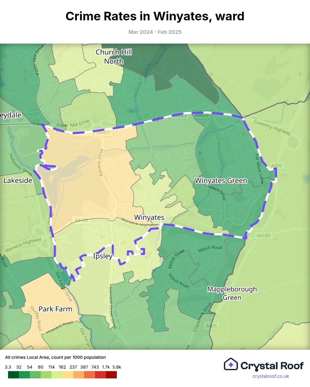 Winyates, (ward) includes areas with the following crime ratings (see map):
