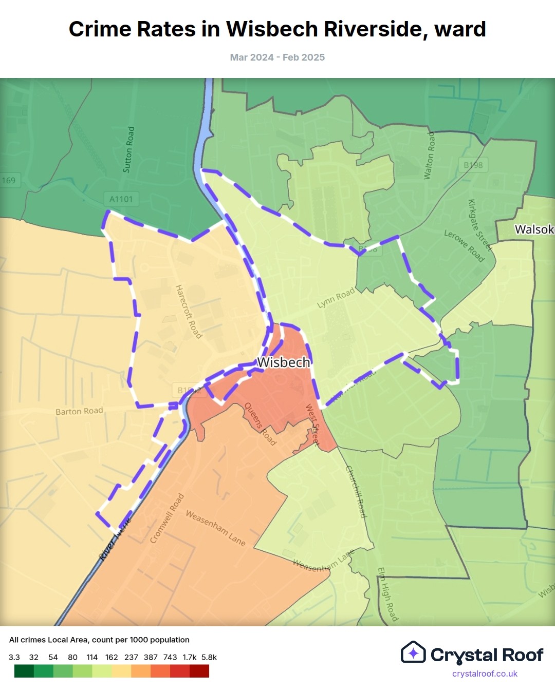 Wisbech Riverside, (ward) includes areas with the following crime ratings (see map):