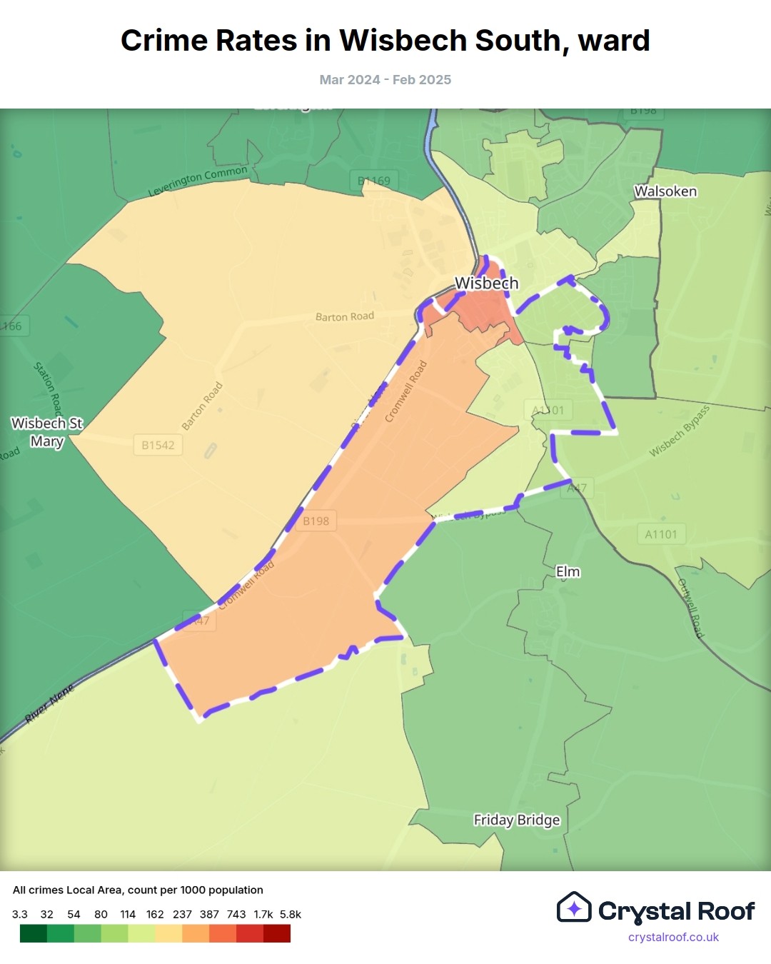 Wisbech South, (ward) includes areas with the following crime ratings (see map):