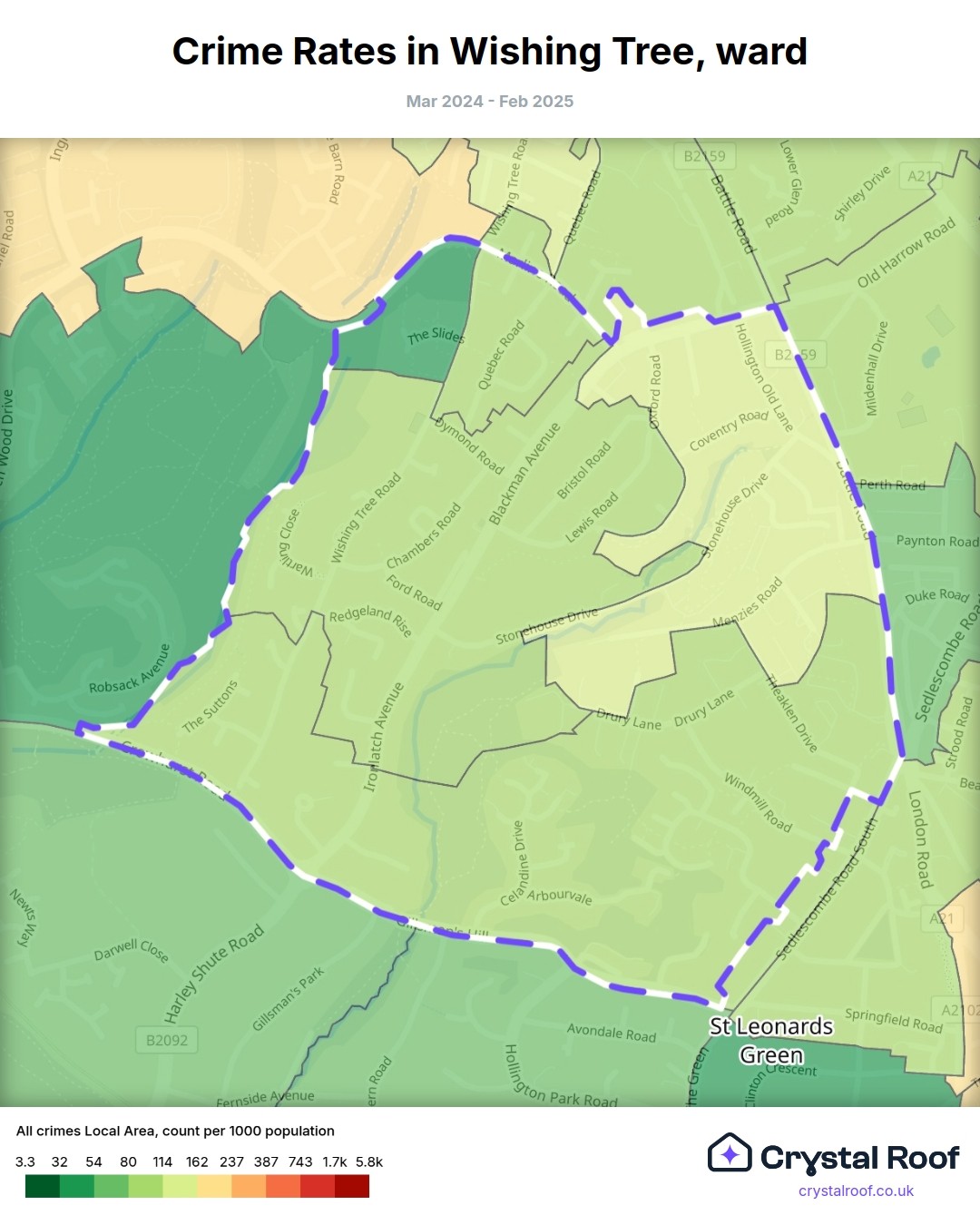 Wishing Tree, (ward) includes areas with the following crime ratings (see map):