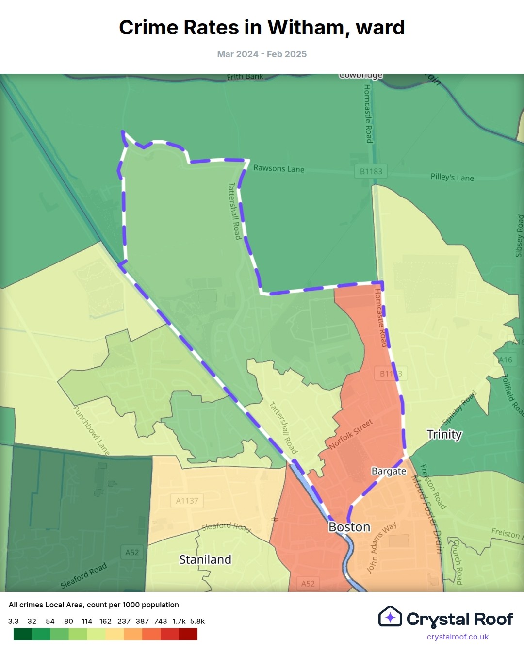 Witham (ward) is located within Boston (borough). Annual total crime rate in Boston (borough) is 113 crimes per thousand resident population, which can be rated as 5 out of 10 or medium crime level compared to other local authority districts in England and Wales.