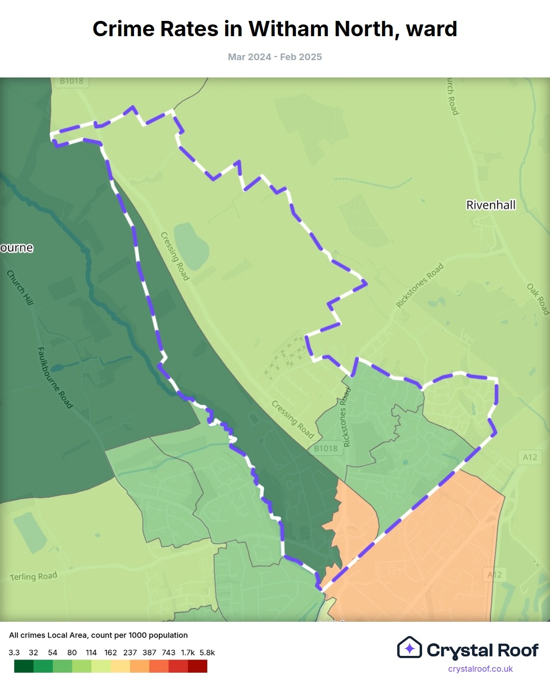 Witham North, (ward) includes areas with the following crime ratings (see map):