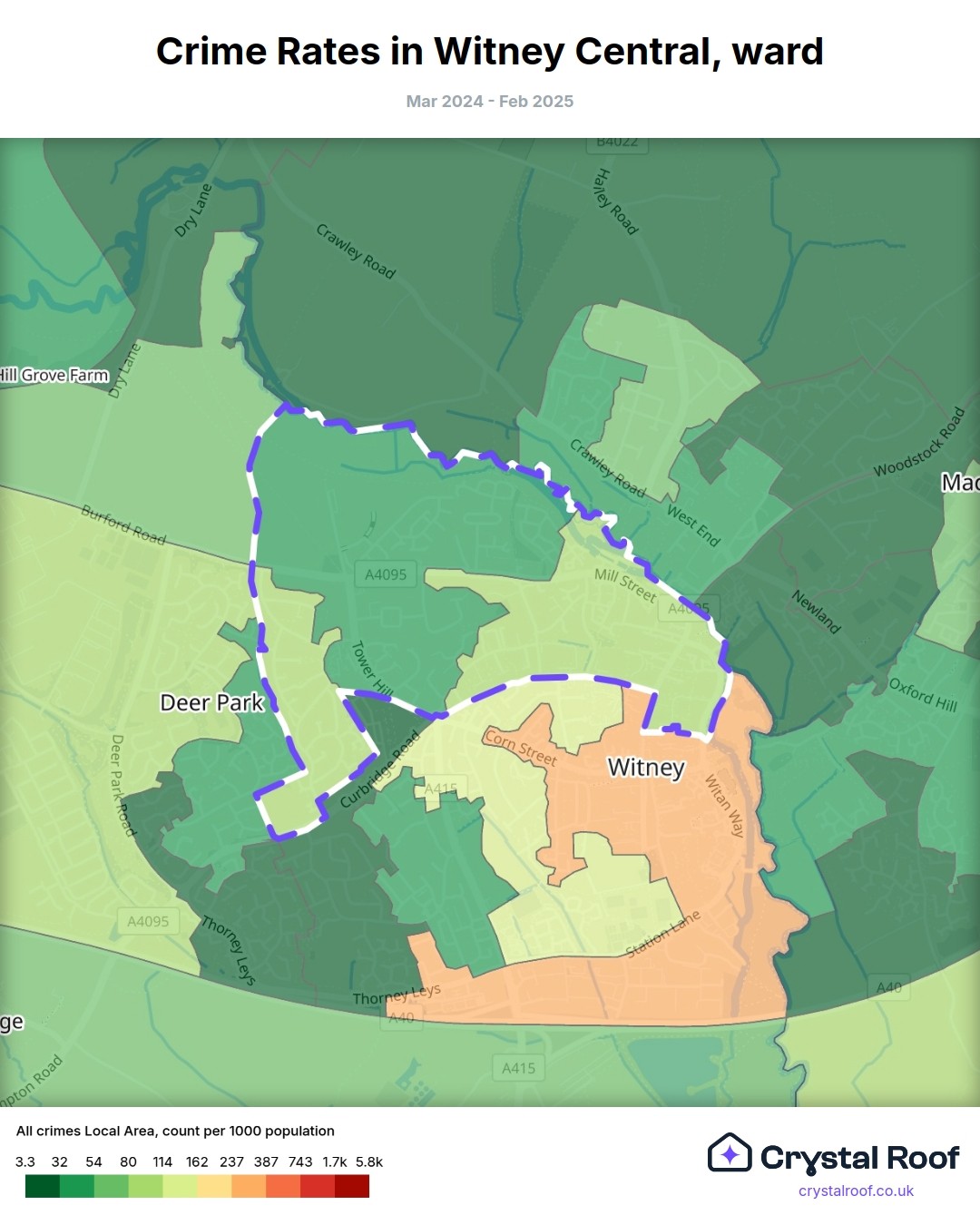 The figures in grey indicate the relative ratings of Witney Central (ward) for a specific crime type compared to other wards in England and Wales.