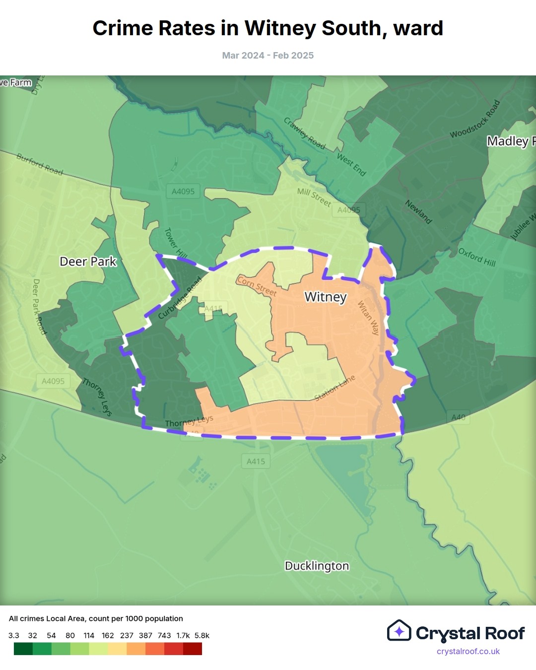 Witney South, (ward) includes areas with the following crime ratings (see map):