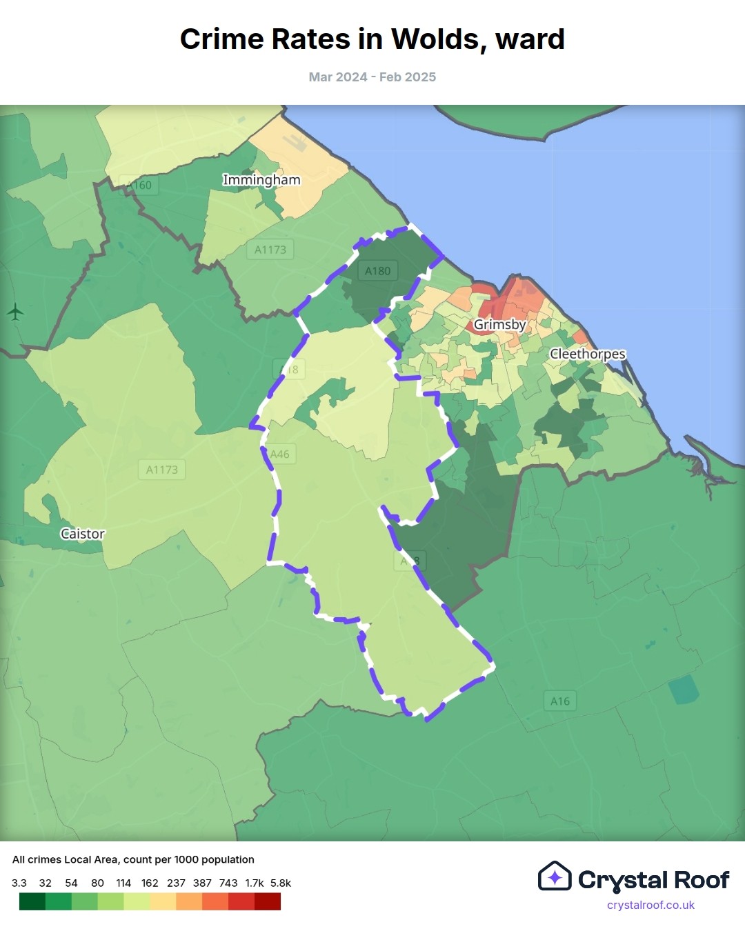 Wolds (ward) is located within North East Lincolnshire (borough). Annual total crime rate in North East Lincolnshire (borough) is 125 crimes per thousand resident population, which can be rated as 6 out of 10 or medium crime level compared to other local authority districts in England and Wales.