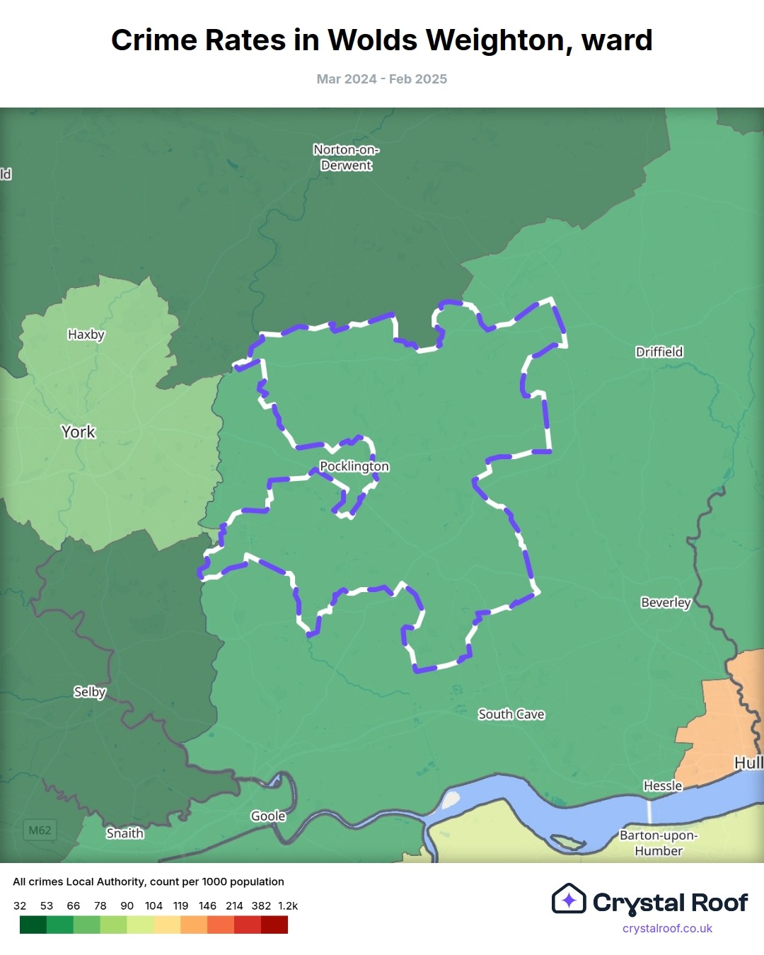 Wolds Weighton (ward) is located within East Riding of Yorkshire (borough). Annual total crime rate in East Riding of Yorkshire (borough) is 56.8 crimes per thousand resident population, which can be rated as 1 out of 10 or low crime level compared to other local authority districts in England and Wales.