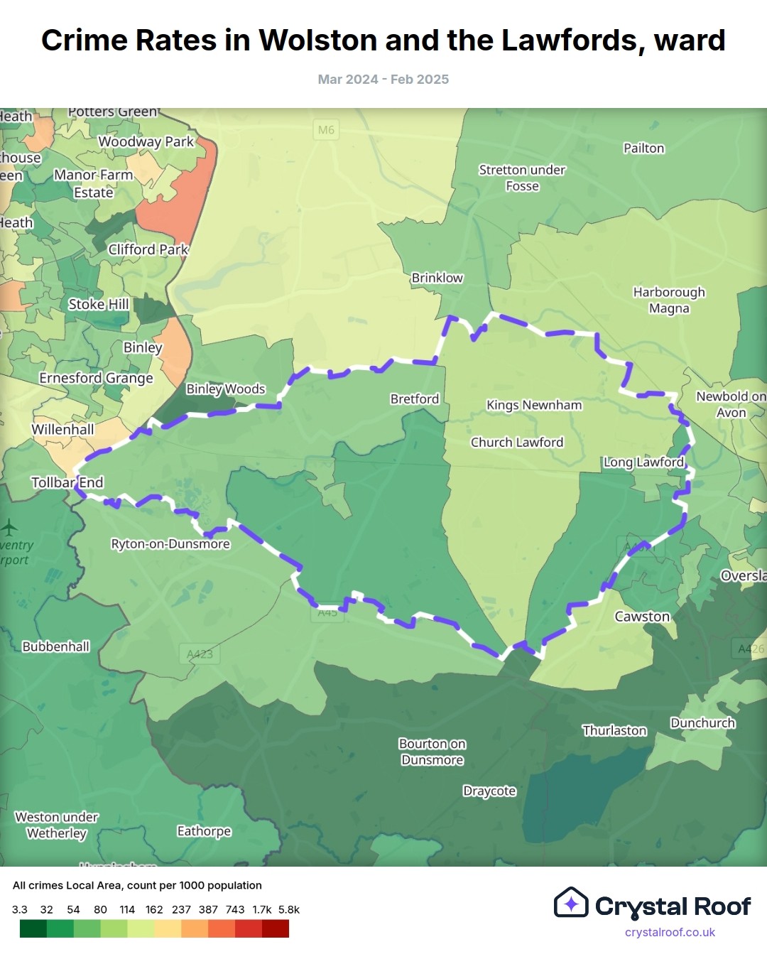 Wolston and the Lawfords, (ward) includes areas with the following crime ratings (see map):