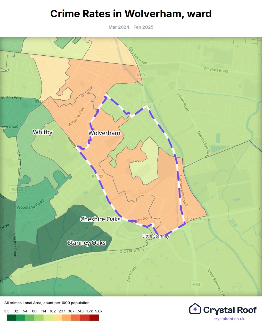 Wolverham (ward) is located within Cheshire West and Chester (borough). Annual total crime rate in Cheshire West and Chester (borough) is 69.3 crimes per thousand resident population, which can be rated as 2 out of 10 or low crime level compared to other local authority districts in England and Wales.