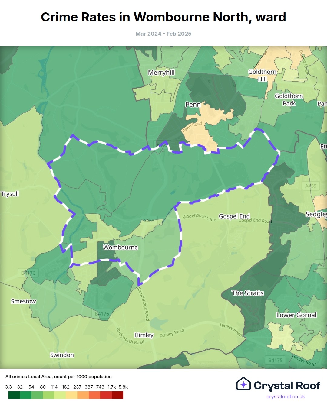 The figures in grey indicate the relative ratings of Wombourne North (ward) for a specific crime type compared to other wards in England and Wales.