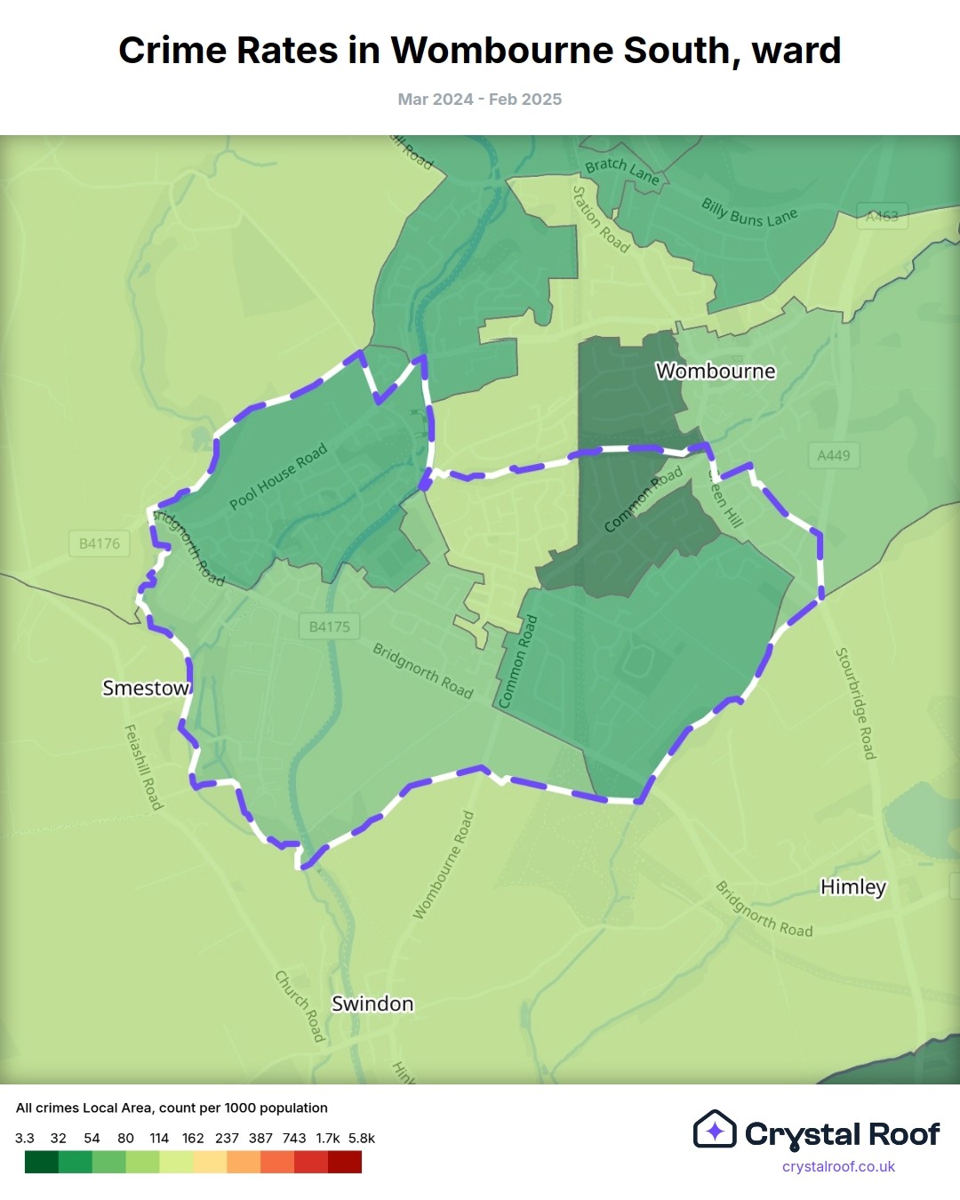 The figures in grey indicate the relative ratings of Wombourne South (ward) for a specific crime type compared to other wards in England and Wales.
