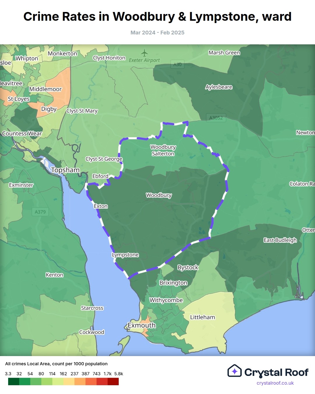 Woodbury & Lympstone, (ward) includes areas with the following crime ratings (see map):