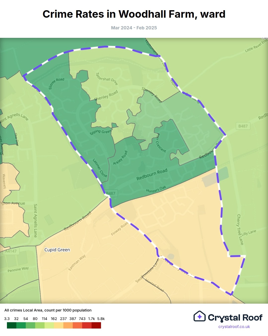 Woodhall Farm, (ward) includes areas with the following crime ratings (see map):