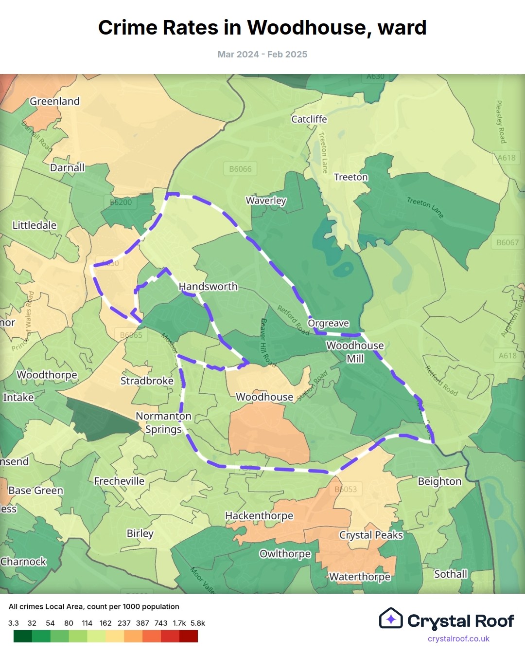 Woodhouse, (ward) includes areas with the following crime ratings (see map):