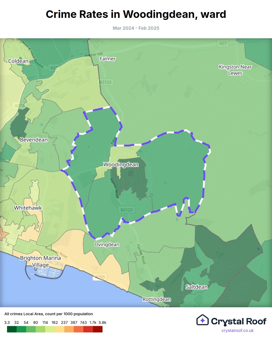 Woodingdean (ward) is located within Brighton and Hove (borough). Annual total crime rate in Brighton and Hove (borough) is 118 crimes per thousand resident population, which can be rated as 6 out of 10 or medium crime level compared to other local authority districts in England and Wales.