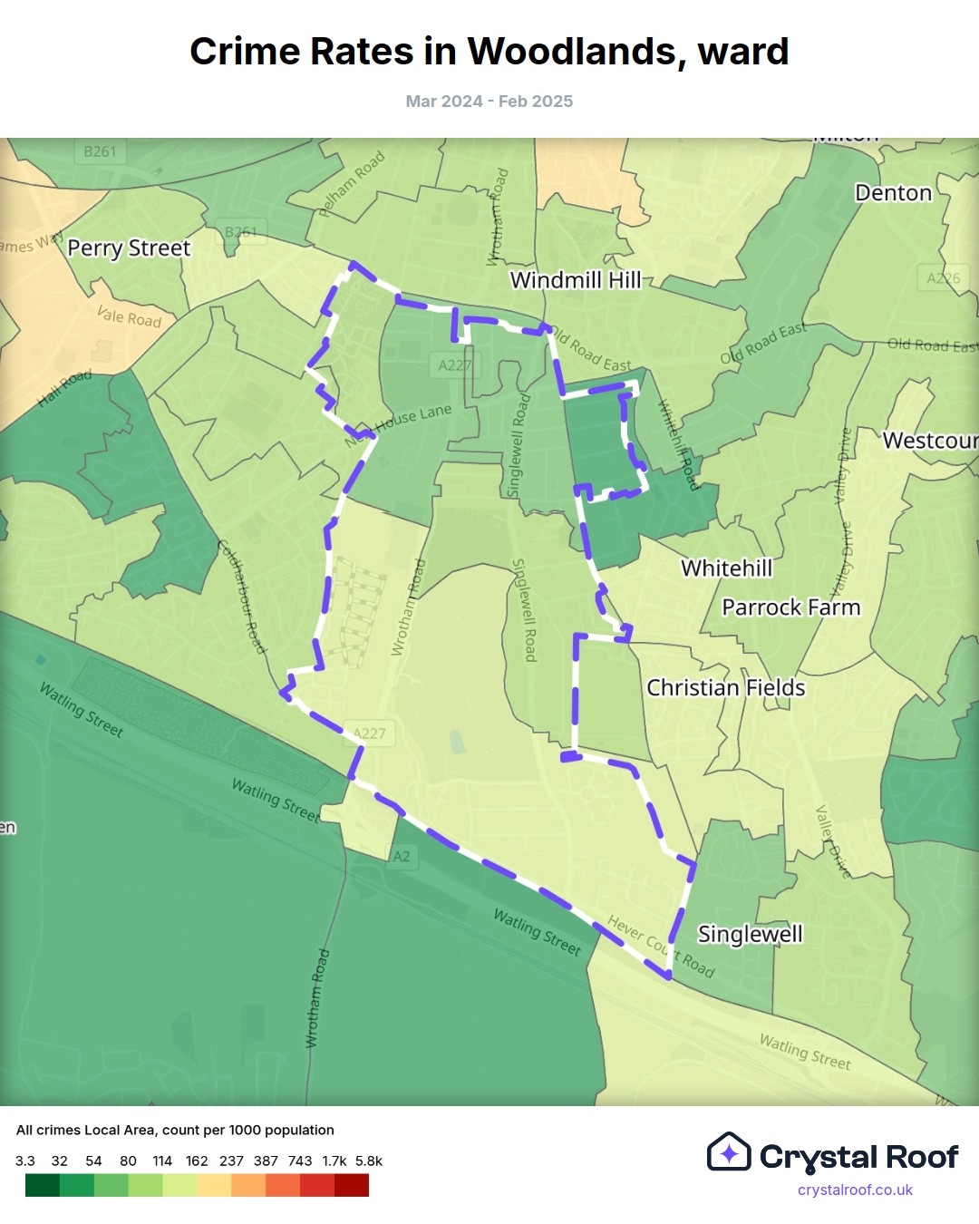 Woodlands (ward) is located within Gravesham (borough). Annual total crime rate in Gravesham (borough) is 106 crimes per thousand resident population, which can be rated as 5 out of 10 or medium crime level compared to other local authority districts in England and Wales.