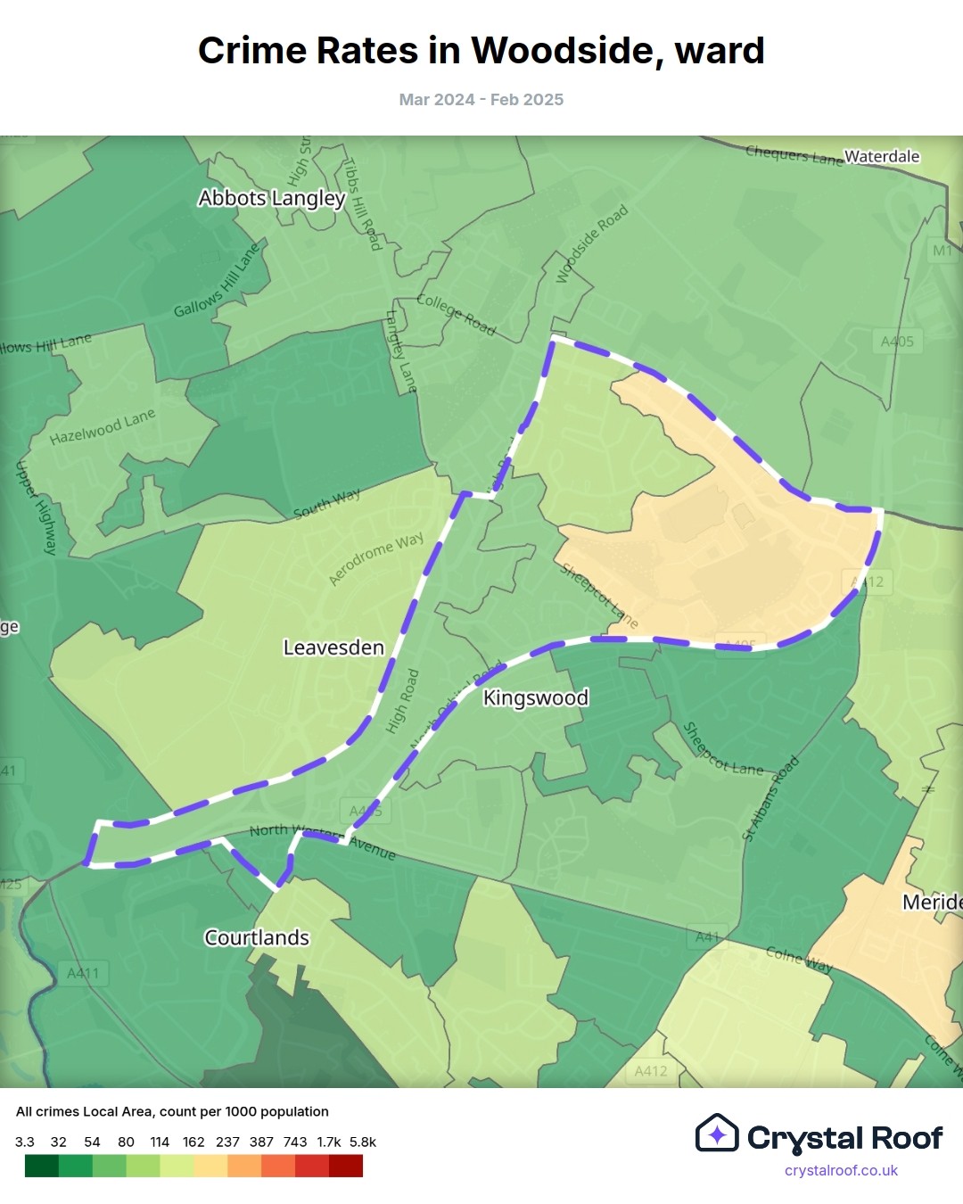 Woodside, (ward) includes areas with the following crime ratings (see map):