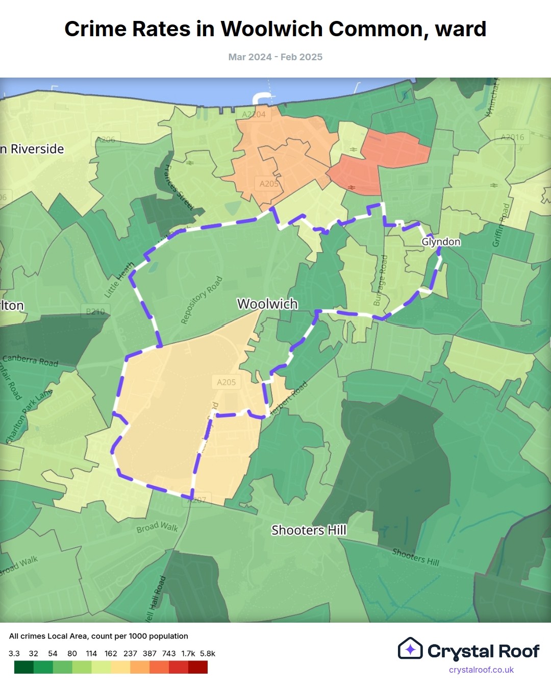 Woolwich Common, (ward) includes areas with the following crime ratings (see map):