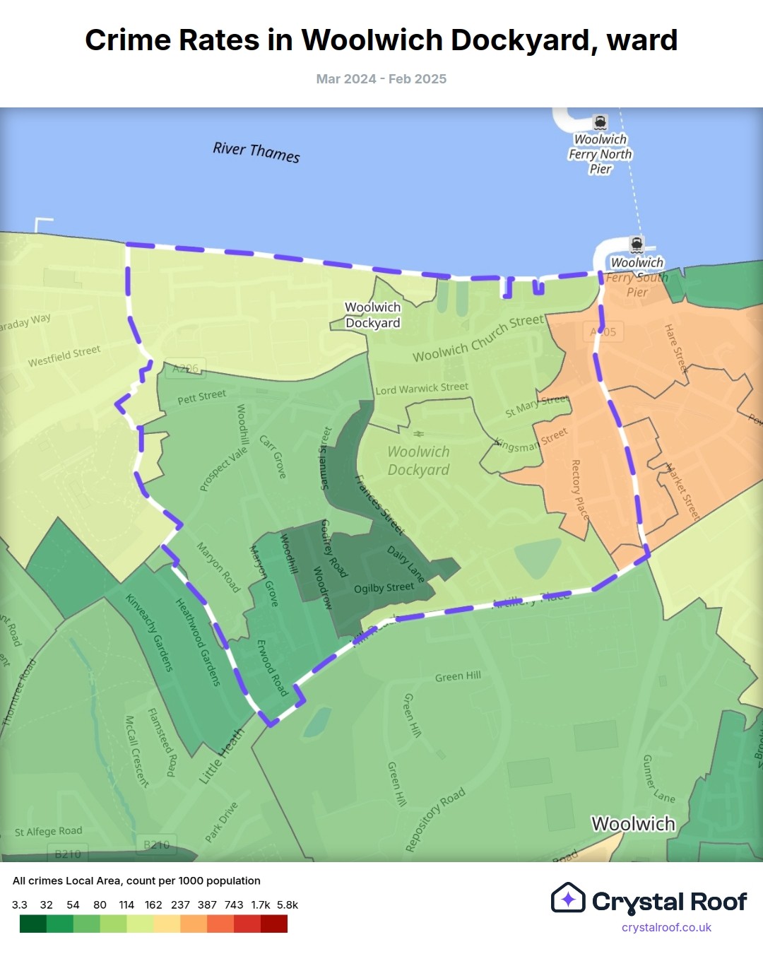 Woolwich Dockyard, (ward) includes areas with the following crime ratings (see map):