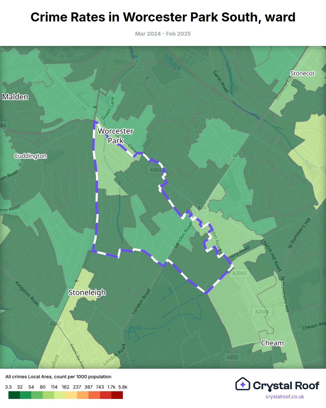 Worcester Park South, (ward) includes areas with the following crime ratings (see map):