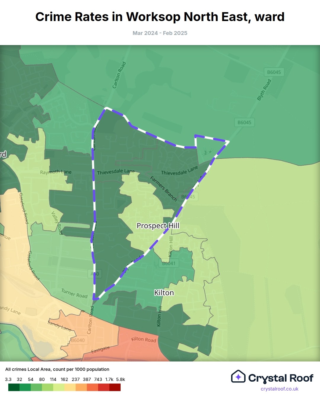Worksop North East, (ward) includes areas with the following crime ratings (see map):