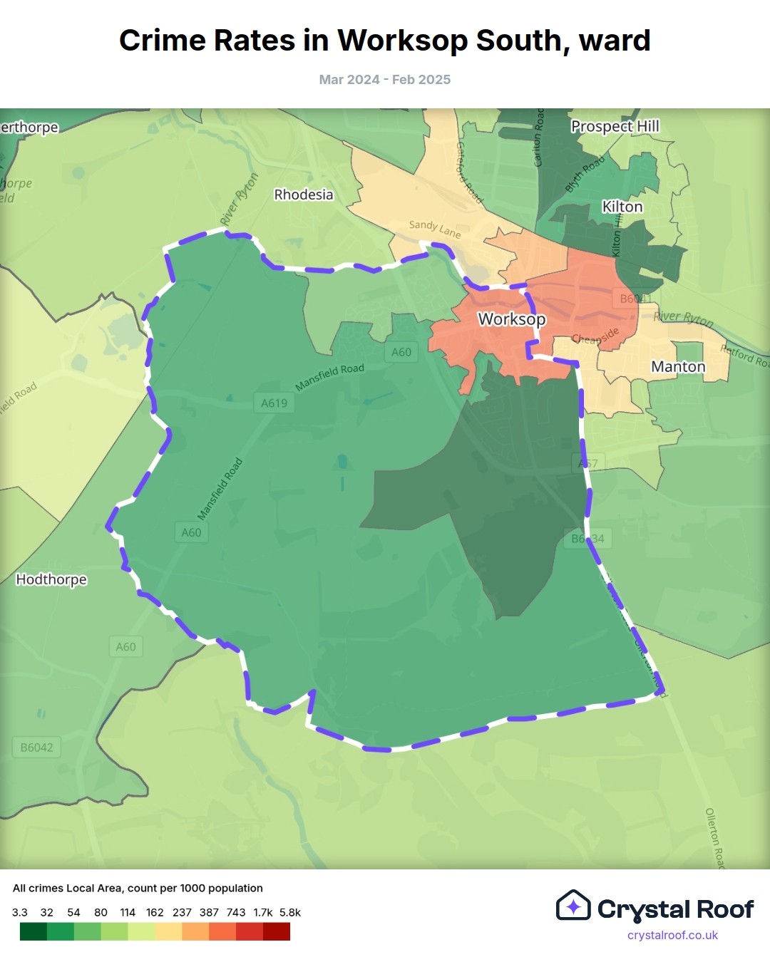The figures in grey indicate the relative ratings of Worksop South (ward) for a specific crime type compared to other wards in England and Wales.