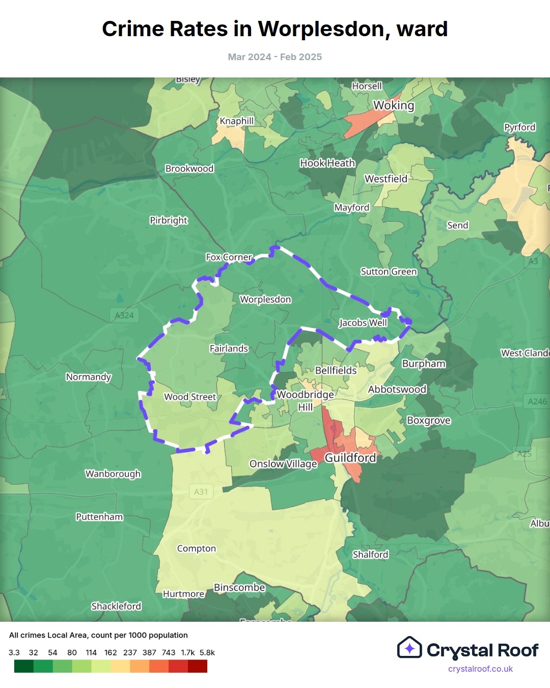 Worplesdon, (ward) includes areas with the following crime ratings (see map):
