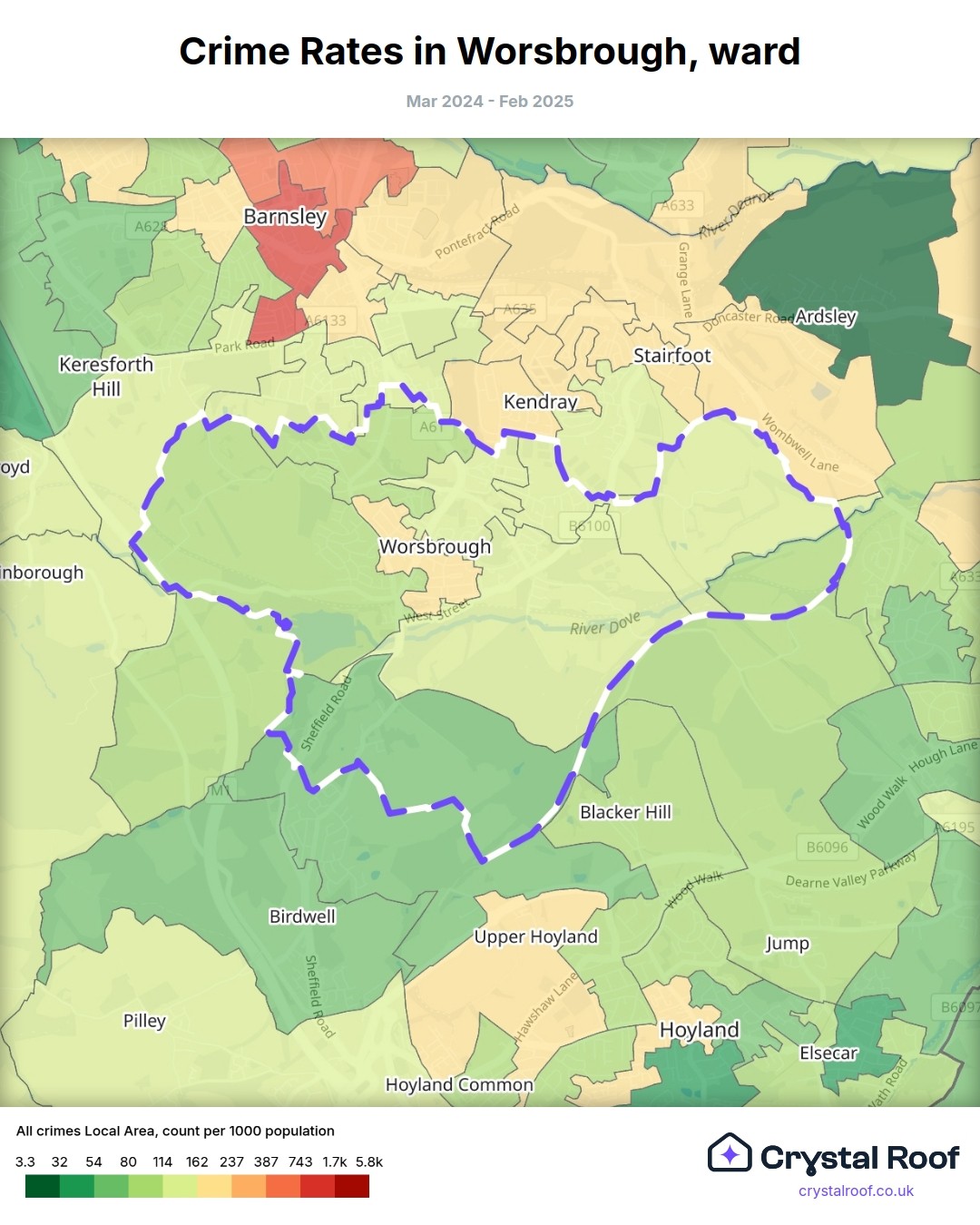Worsbrough, (ward) includes areas with the following crime ratings (see map):