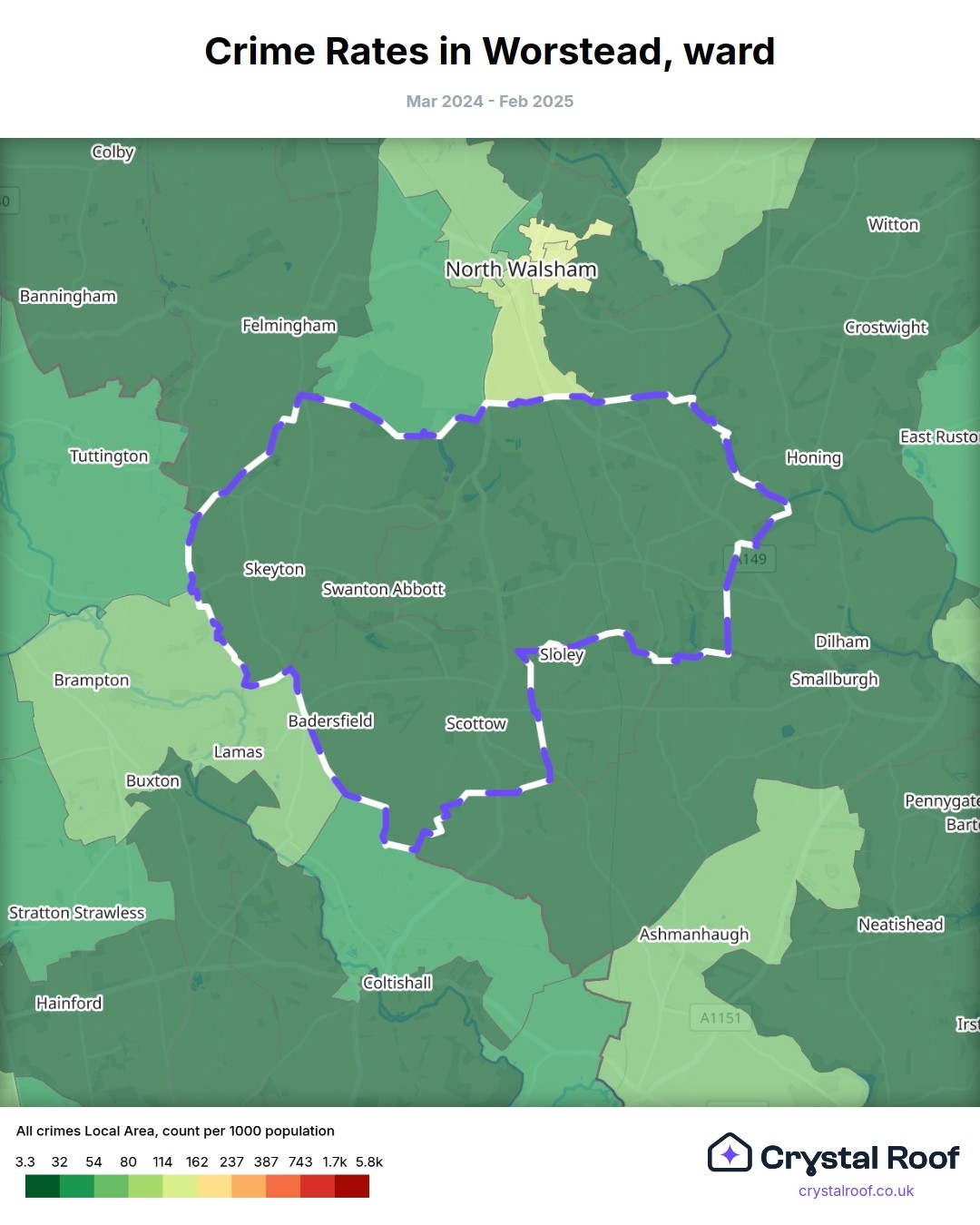 The figures in grey indicate the relative ratings of Worstead (ward) for a specific crime type compared to other wards in England and Wales.