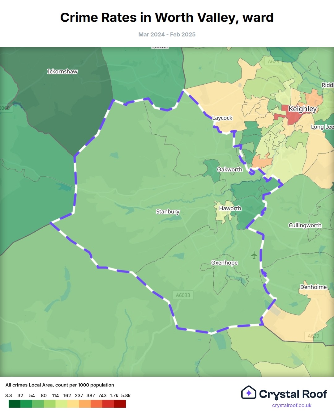 The figures in grey indicate the relative ratings of Worth Valley (ward) for a specific crime type compared to other wards in England and Wales.