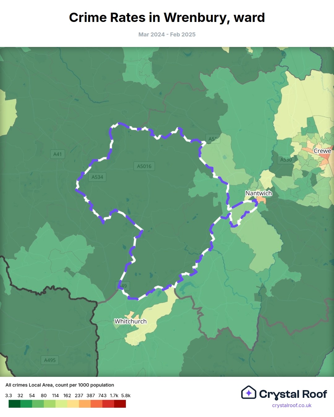 Wrenbury, (ward) includes areas with the following crime ratings (see map):