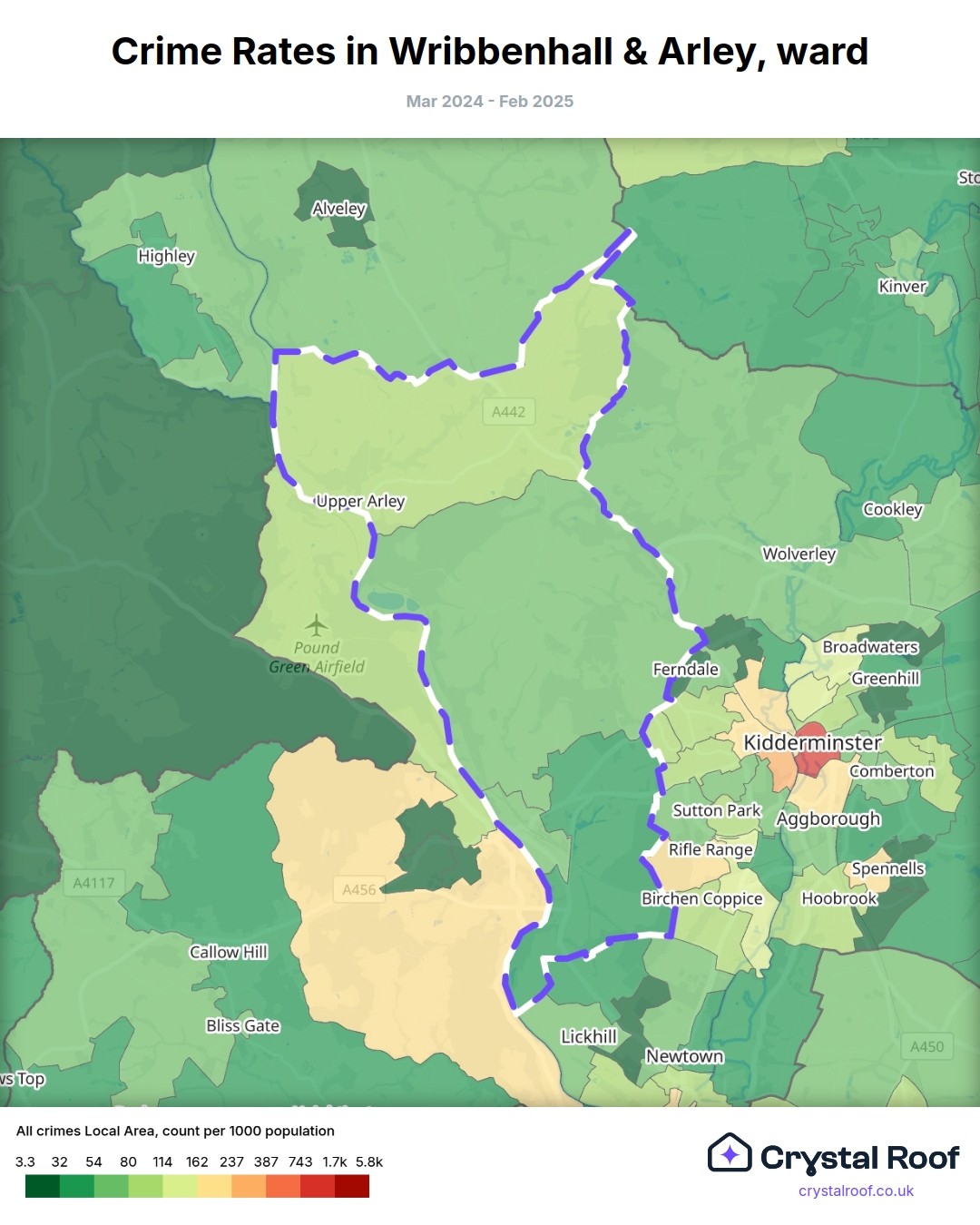 Wribbenhall & Arley, (ward) includes areas with the following crime ratings (see map):