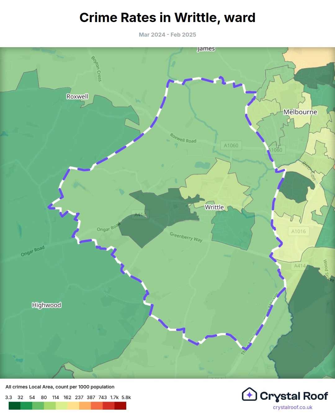 The figures in grey indicate the relative ratings of Writtle (ward) for a specific crime type compared to other wards in England and Wales.